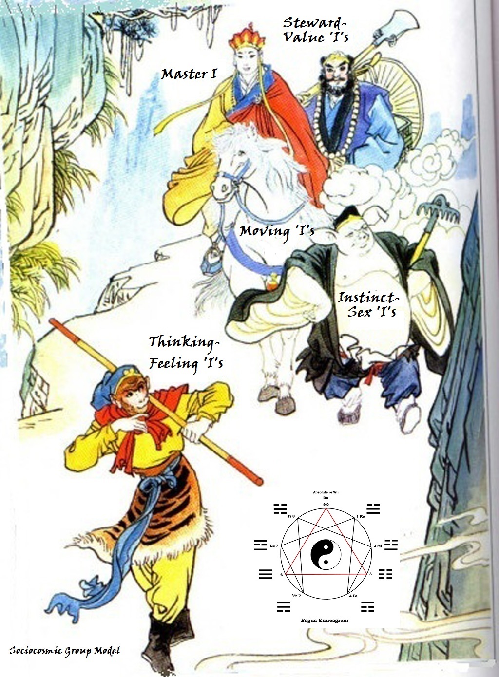 The journey in search of Bagua Enneagram ....... "If Beelzebub together with His Grandsons and Daughters, Sun Wukong, the Monkey God of Pilgrimage to the West and Jigong, one of Great Oriental Buddhas have descended once again to Mother Earth to witness the stage of development of this organic film they will not be surprised as predicted and will soon find a haida yoga way to work with the 4-horned 'bio-socio-techno-AI/AGI' film coating the surface of the living Mother Earth." Cosmic Stone Being Sun Wukong formed from the primal forces of chaos whose eagerness and intelligence began to disturb the Kingdom of Heaven, rebelling and creating havoc above at the TI-DO Interval of the Great Cosmic Ray of Creation, was finally exiled to Earth by Buddha and imprisoned there at the MI-FA Interval of the Great Cosmic Ray of Creation under the Five-Finger Mountain for 500 years awaiting a Saviour Priest, Tang Xuanzang, to help in atoning him and also those other exiled 'rebels-of-the-Heavenly-Kingdom-of-the-same-fate' for their previous crimes, namely Being Pigsy, Being Sandy and a Being Dragon Prince Horse who was the vehicle of transportation for Xuanzang along an arduous journey to the West. During the journey the group encountered a series of eighty-one tribulations before accomplishing their mission and returning safely to China. Sun Wukong often acted as his bodyguard and given free access to the powers of Heaven to combat these threats. Sun Wukong was finally granted Buddhahood for his service and strength after successfully completed the mission and return to the TI-DO Interval of the Great Cosmic Ray of Creation. During this Sun Wukong period the technocosmic octave has not yet budded and the only sociocosmic octave prevailing is the sociocosmic stopinder being bearing the common name 'Kingdom' or 'Dynasty' where the gravity-center focus is the feeling-moral stopinders supported by the reasonably 'objective' reasonings. The model of man is depicted by the Chinese during the Piscean Astrological Age. No sciences, technologies or machines were introduced into the tales - they belong to the coming Aquarian Astrological Age. Cosmic Being Beelzebub, originated from the planet Karatas in some distant sun systems, on the other hand, because of immaturity and impetuosity of his youth he became convinced that the running of the Great Universe was designed, constructed and conducted "illogically." His conviction about this he vigorously propagated to others until the whole Megalocosmos was brought near to the brink of revolution also at the TI-DO Interval of the Great Cosmic Ray of Creation. Like Sun Wukong, this stirring up of trouble in the Heavens has earned him an exile to the system Ors, our Solar System for his tribulations. Together with his comrades and their attendants and subordinates, namely, Hassein, Ahoon, bird-looking like scientist being Gornahoor Harharkh, he flew in the spaceship, Karnak and finally settled on the planet Mars - one of the family of planets near Mother Earth who has already been chosen, because of her meeting most of the mandatory conditions required by the Above for placing Organic Life in the MI-FA Interval of the (our) Great Cosmic Ray of Creation. While others migrated to the surrounding planets in our Solar System (Ors) for further explorations of the planetary family members of this Solar system, Beelzebub, however, remained on Mars and there decided to construct an observatory to aid him in the study of ecosophical surrounding phenomena amongst Mother Earth and her Moon, her other planetary family members and the Sun in the Solar System, and the astrological influences of the distant Zodiac constellation on her. His mission was so far-reached and so great with much tribulations that he needed to be assisted occasionally by cosmic beings from Above in the Ray of Creation, namely, Chief-Common-Universal-Arch-Chemist Physicist Archangel Looisos and Most Great Archangel Sakaki, from the Zodiac constellations, and also had to resort to the enriched "NOO" of the noetic fields notably with much mystifying feeling vivification and leftover noomakhian teachings of the those previous sacred and saintly individuals also sent from Above to Earth which is the chosen MI-FA Interval planet where organic three-brained beings bred in large numbers have to be helped in the process of preventing the 'Fall of Man' from taking place, and to assist in their ascend. Beelzebub's attention was much disturbed by another sociotechnocosmic rebel on Mother Earth who had already created terrible havoc to Mother Earth having being responsible for causing terrible consequences as witnessed in for a few of their centuries such terrible and horrible sociocosmic perturbations - colonial wars, imperialist wars, fascist wars, hegemonist wars, World War I, World War II, revolutionary wars, cold wars, hybrid wars, color revolutionary wars and the full spectrum wars. This hegemonistic totalitarian democratic power was then growing stronger and stronger in the existing organic film coating Mother Earth's surface during the Age of Aries and the Age of Pisces. This Arch Disturbing Being is called Hasnamuss and his 313 eternal being-helpers dwelling on the planet 'Eternal-Retribution'' who were also hypnotically under the much accursed spell of the ABYSS as the then growing and maturing sacred 'Objective Reasoning' of the mental stopinders of man was forcefully drawing much energies in their inner centers to severe being-psyche starvation and also burying in dismay the sacred 'Objective Emotion' especially 'the Conscience' of their feeling stopinders. Armed with much abused high-tech weapons of precision engineering technologies and sciences together with state-of-art-modern administration and politics of '-isms', '-cracies', etc., Hasnamussian rebels' madcap perturbic teaching and activities too had propagated to every corners of Mother Earth - messing up the inner harmonious working of the collective 