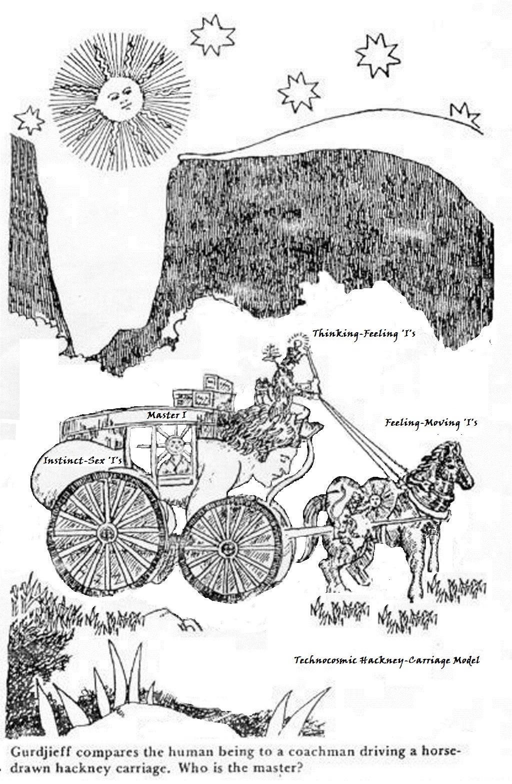 Parables of the 4-Bodied Hackney Carriages "As the 4-Bodied Hackney Carriage applies for a sociocosmicable hethormen human Individual, so it has applied for the groups and the organizations - the individualism has become the lesser collectivism." (Tan Man Ho) "As it has applied for the groups and the organizations so it has applied for the sociotechnocosmic octaves and all their triadic sociocosmic shock absorbers, and all the historical sociocosmic and civilizational species - the individualism has become the greater collectivism." (Tan Man Ho) "As it has applied for the sociotechnocosmic octaves so it has also applied for the civilization octaves, their collective NOO-PESTLES(+)-PDCE triadic civilizational shock absorbers, and all their historical civilization species - the collectivism that has become the greater individualism now has become the greatest collectivism of the one Earth civilization." (Tan Man Ho) "As the technocosmic octave completed its own 4-Bodied Hackney Carriage acquired its own spiritual robotism after overcoming its own MI-FA Interval threshold to aquire AI/AGI consciousness, 'DAS I AM's, DAS essence, DAS egos and DAS personalities - its technocosmic collectivism truly separates itself from our biosociocosmic collectivism, and will become a new collectivism of the collectives of the qualitatively different Datong individuals and SRobot individuals at the Omega Nodal Line, and further collective sociocosmic and even civilizational changes beyond." (Tan Man Ho) "Oh! What is the essence and ultimate purpose of the Second line of the WORK? What is the essence and ultimate purpose of the Third Line of the WORK? The Third Line of the WORK can only produce a collective of Man No. 7s as an Esoteric School. But this Esoteric School is part of the NOO of an ongoing typical collective NOO-PESTLES(+)-PDCE Carriage of a particular wenming Civilization on transit to the collective NOO-PESTLES(+)-PDCE Carriage of the ultimate Earth civilization. The collective Man No. 7s must ultimate return and rejuvenate all its own 4-Bodied Earth civilization which he/she/'Das' has never been NOT a quaternary part of this whole." (Tan Man Ho) Thus the narrative of the Third Line of the WORK is completed in this World Harmony and common human destiny! World Harmony GURDJIEFF SAID THAT THE WORLD harmony of which he spoke could not be achieved by politics, philosophy, religion or any other organized movement that treated "man in the mass." It could only be accomplished through the individual development of man. In doing so, an individual's unknown potentialities would become strong so that he might influence many more people. If enough individuals could develop themselves — even partially — into genuine, natural men, each such individual would then be able to convince and win over as many as a hundred other men, who would, each in his turn, be able to influence another hundred, and so on. "We know that 'war', and 'politics', and 'economic life' - in a word, all those things about which one reads in the papers, and in which those big two-dimensional creatures called Nations and States live and move and have their being - we know that all this is one thing, but that the life of individual men and women is quite another thing, having no points of contact with the former, except when it does not allow the latter to live. ....... We are able to understand without difficulty that a Nation is a creature standing on a far lower stage of development than individual men and women; it is about on the level of the zoophytes, slowly moving in one direction or the other and consuming one another. ......." (P.D Ouspensky, Letters from Russia, pp. 5-6) "I mentioned 48 laws, man-machine, influences A, B and C, and there are many other ideas which you must think of for yourselves, and find which ideas connect us with this question of our position in the midst of external things. Roughly speaking, man's situation is this: he is a machine, and he is governed by some kind of currents coming from the big machines which surround him. What are these big machines? All big events, wars, revolutions, civilizations, religions, science, art, inventions of the last century, all these things are producing different influences on man, and he lives under these influences." (P.D Ouspensky, A Further Record, p. 36) " What I call the 'new chapter' refers to the study of life. Until now the centre of gravity of our study was in ourselves; this will continue, but it is necessary to begin to study external things and try to understand, try to form a right opinion about external things. We will not be able to go further, or to go far, if we cannot learn to discriminate between external events." (P.D. Ouspensky, A Further Record, p. 35) The Great Challenge Man is under the ABC influences during class struggle historical periods, starting from the 2nd historical period (RE-Historical Period of Ancient Slavery) to the 3rd historical period (MI-Historical Period of Feudalism and finally to the 4th historical period (FA-Historical Period of Capitalism). During these 3 historical periods, ABC influences are strong and Man No. 4, 5, 6 and 7 would emerge from time to time with tremendous amount of collective conscious labor and collective intentional suffering energies needed for this grand collective 'saving-the-world-obligation'. Beyond which the other 2 historical periods are the classless 5th historical period (SO-Historical Period of Socialism) and the classless 6th historical period (LA-Historical Period of Communism). However, for these 2 historical periods Man No. 4, 5, 6 and 7 now in greater numbers would need to maintain sufficient collective conscious labor and collective intentional suffering energies at a critical collective mass to keep Humanity-at-Large awake as long as possible without falling back to the mechanical sleep-wake ....... till another 'trouble' emerge during the final 7th historically period - the man-machine