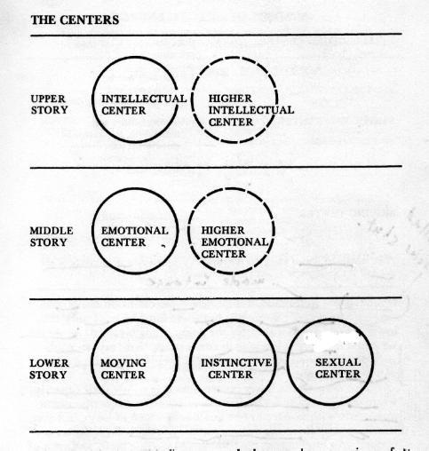 "Higher emotional and higher intellectual differ from the ordinary thinking and emotional centres, first, in their speed, and second, because they have no negative parts,, there is no 'No' in them. 'No' is exactly the thing that keeps our centres working at a low speed. A centre cannot work properly if it has 'No' in it. Real centres, i.e. higher centres which work without 'No' we cannot understand. Why cannot we understand them? Because we think in a centre with 'No' in it; so we cannot understand what it means to think or feel without 'No'." ( P.D. Ouspensky, A Further Record, p. 39 )