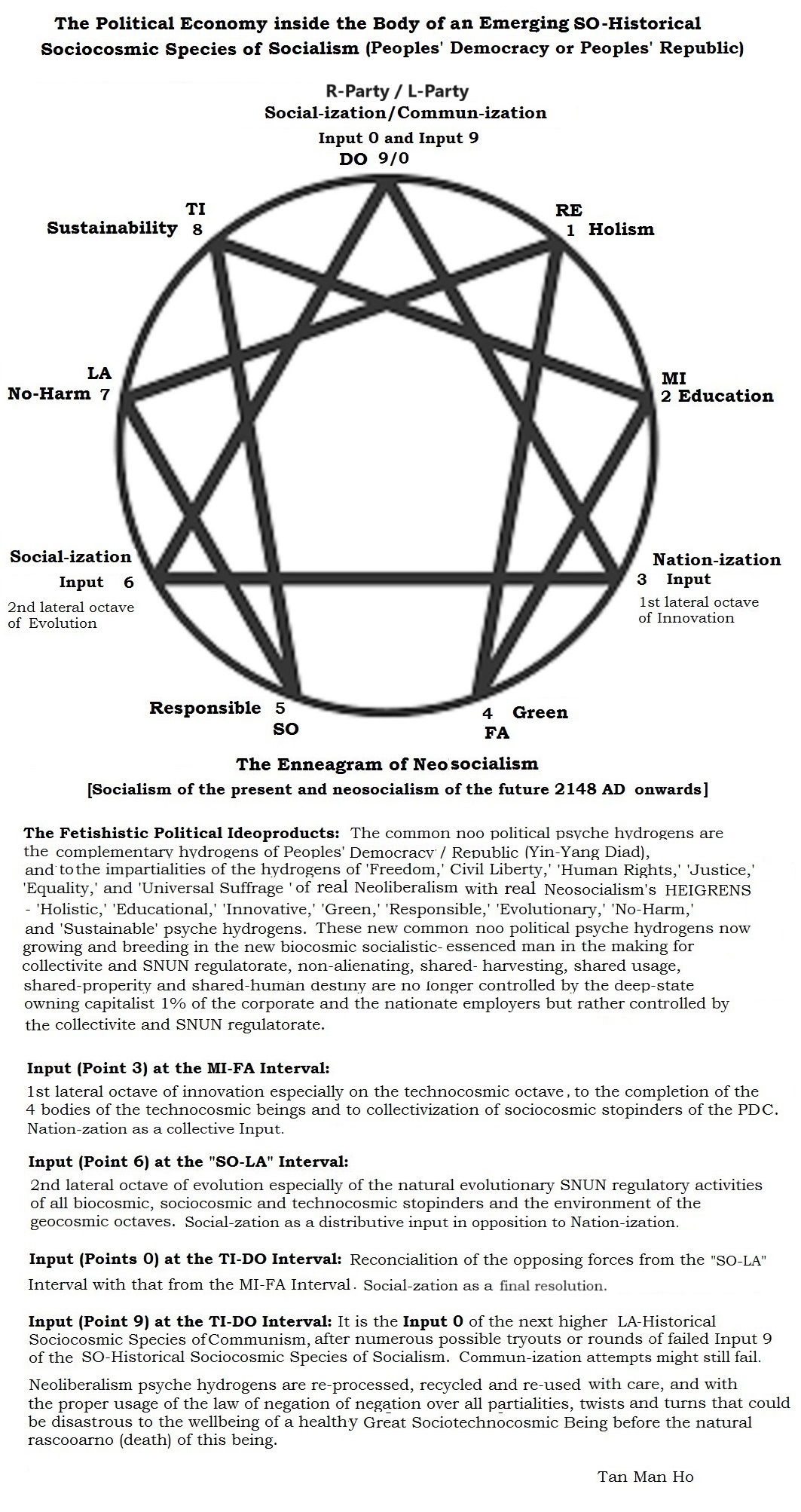 Great Sociocosmic Being in the real world. Behold that there, ideas and concepts that spring out from the 7 psyche hydrogens reservoirs grow into noo trees and branches of knowledge in the world of knowledge, which also group or noo-stopinderates into the 'alphabets' or 'symbols' of a language including musical symbols, 'words', 'topics', 'sections', 'chapters', 'subjects', 'articles', 'books' and 'encyclopedias' all reflecting and connected to the inner and outer worlds by strong feelings to the psychomotor behavioral mechanism ready to act. Having emerged into the outer world, they will soon be accepted, recognized, registered wenming civilizational noo-stopinders with ‘proper names’. The spiritual being psyche hydrogens or noo ghosts move in and out of the mainstream sociocosmic stopinders of both the fundamental and the lateral sociocosmic octaves elusively - these noo ghosts is found both in the fundamental and the lateral sociocosmic stopinders venturing in the inner world of man and only in the inner world of a man in intrinsic sociocosmic octave integration and communication among all other men near or far in the outer world, and certainly in association with all other octaves of the outer world of man - biocosmic, technocosmic, cosmic, technocosmic, geocosmic, geobiosociotechnocosmic, geoethnic, anthrocosmic, quantum-cosmic, human civilizational-cosmic, and etcetera linked their beings to our beings because of our active reflection, nomenclature and general-naming them. They can be like wriggling snakes in the great sociotechnocosmic tree. They are also like Mistress Invisibles, that vivify, give life and an emanating exterior aura (animal magnetism) to all the activities in this Great Sociotechnocosmic Being! One and the same group of noosphere hydrogens may function for the biocosmic octave, the sociocosmic octave and the technocosmic octave, and the psychic centers involved or part of the psychic centers involved may be the higher thinking and the feeling center, the lower thinking and feeling centers, the instinctive center, the moving center and the sex center. It is important to note that the technocosmic beings have no noo of their own, both in the bodies of the FA-Historical Sociocosmic Species of Capitalism and the SO-Historical Sociocosmic Species of Socialism. They, the technocosmic beings created, sponsored and maintained by the biocosmic modern man are still incapable of having a biocosmic or a technocosmic (synthetic) 'it's, 'I's and certainly far from having 'I AM'. Nay more, for the biocosmic modern man few have such biocosmic 'I AM.' It was then that many of these special psyche hydrogen concentrations, stopindered as being-concepts, being-topics, being-subjects, found their presence in my head, and in every head. Besides involving the thinking centers as above many more such noosphere stopinders were formed in the body of the beings themselves. They are noospheres to all fundamental and lateral sociocosmic octaves.