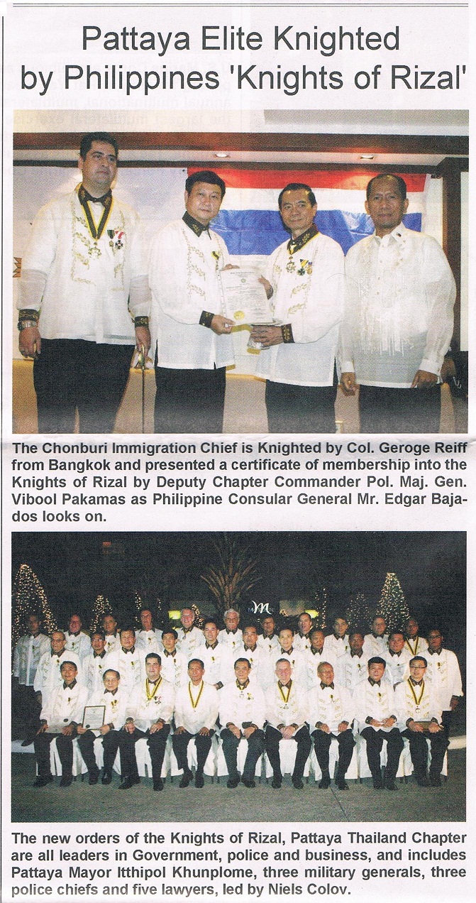 Friday, 08 April 2011 From Issue Vol. XIX No. 14 By Col. George Reiff, KCR. Pattaya Mail: The Knights of Rizal, one out of two state orders of the Philippines, has officially introduced its first chapter in Thailand under the auspices of the Philippine Embassy in Bangkok. The order was originally founded 100 years ago in order to commemorate the teachings and works of Philippine National Hero Dr. Jose Rizal. Also, the Knights of Rizal obtained their present legal standing as public law corporation according to Parliament Act Number 646 in 1951. As Dr. Jose Rizal was the first known person in modern history to have employed non-violent resistance, and as he has been quoted for that by Gandhi of India and by Dr. Sun Yatsen of China, the Knights of Rizal have a strong international outreach to all nations of the world. Chapters exist from UK to US and from Malaysia to Bahrain. The organization was introduced into Thailand by Col. George Reiff who organized the first initiation of 4 Knights of Rizal in Bangkok on 10 of April 2010. In the meantime, the number of Knights increased and so the chapter could be established today.